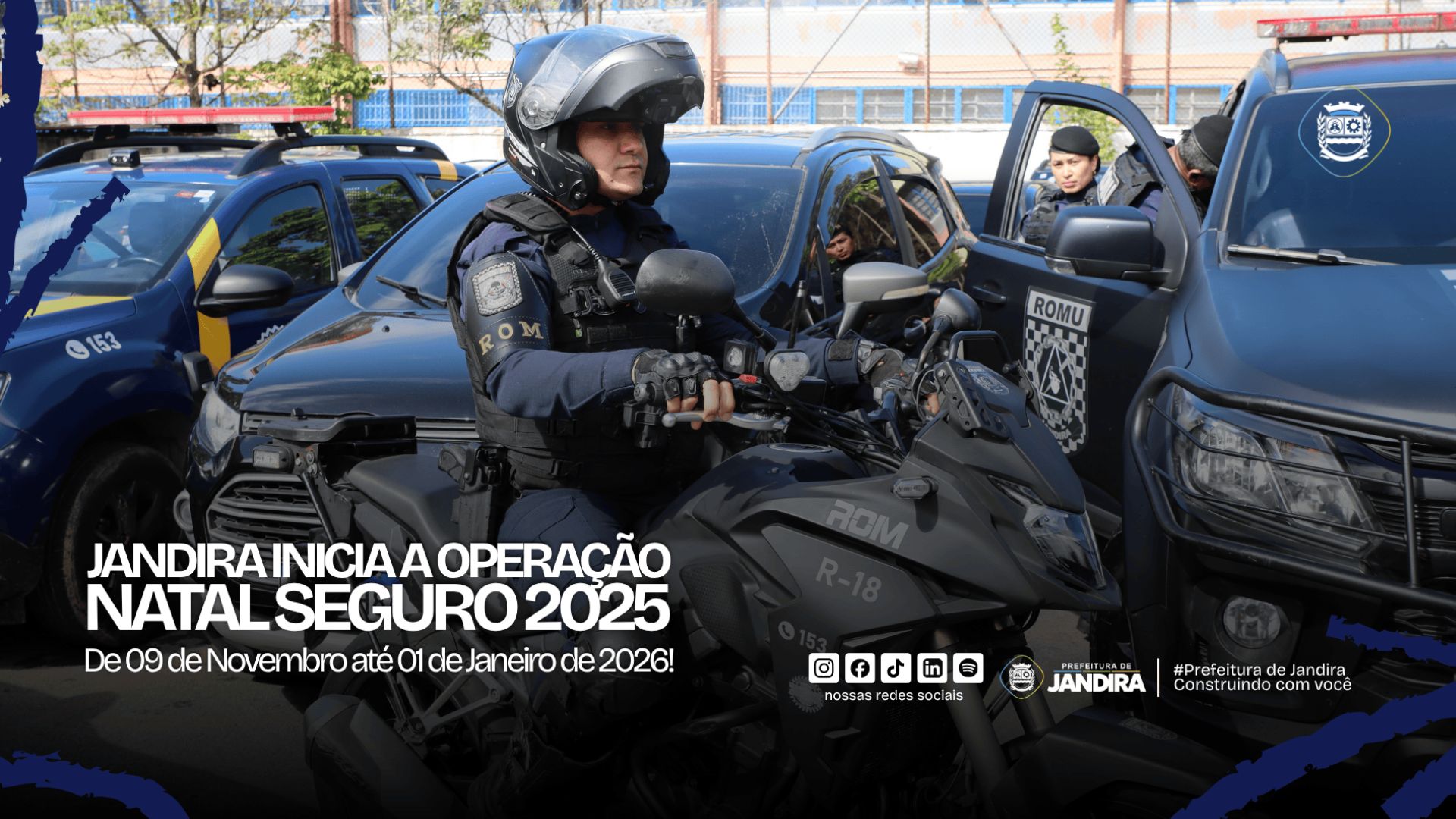 A Prefeitura de Jandira iniciou, no dia 9 de novembro, mais uma edição da Operação Natal Seguro, ação estratégica que reforça a segurança da cidade durante o período de festas de fim de ano. A iniciativa segue até 1º de janeiro de 2026 e reafirma o compromisso do prefeito Dr. Sato em garantir mais tranquilidade, ordem e proteção para os moradores.