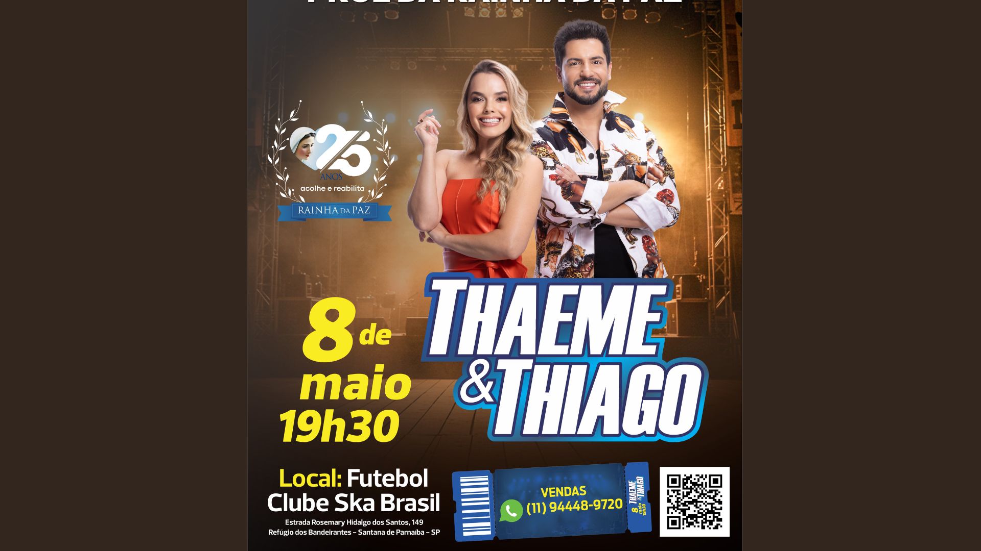 A cidade de Santana de Parnaíba recebe no próximo dia 8 de maio um grande evento que promete unir música, emoção e solidariedade. A consagrada dupla Thaeme & Thiago sobe ao palco em um show beneficente em prol da Comunidade de Amor Rainha da Paz.